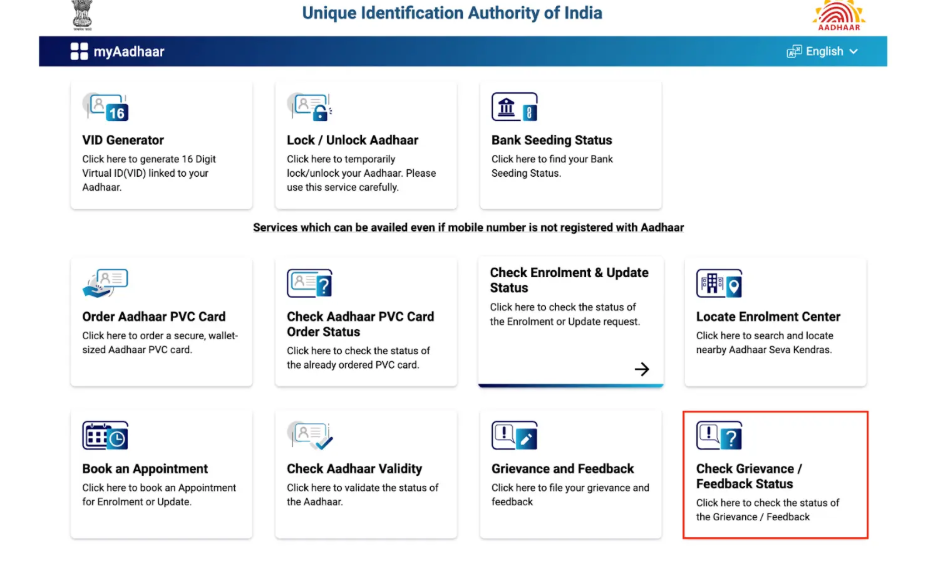 - Online Support: Complaint tracking and service request monitoring via the UIDAI portal.